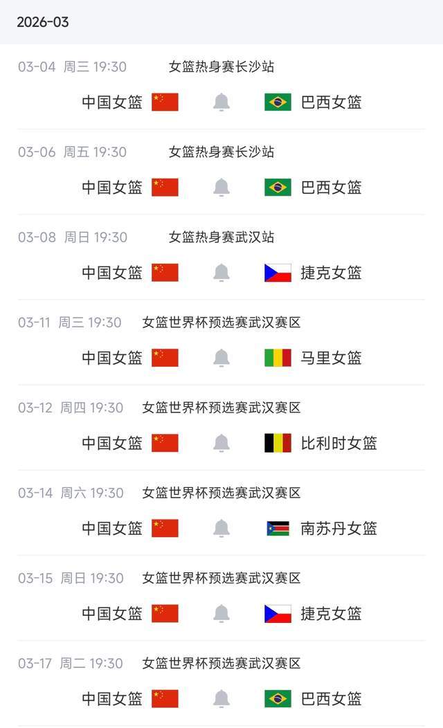 中国女篮的赛事安排是:3月4日、6日在湖南长沙和巴西女篮打两场热身赛。随后3月8日来到湖北武汉,和捷克女篮打一场热身赛。(这两个对手,也是接下来世预赛的对手)——3月11日开始,中国女篮就将正式开启世界杯预选赛之旅:同组对手不是特别强,先战马里、比利时和南苏丹。随后再战捷克和巴西。